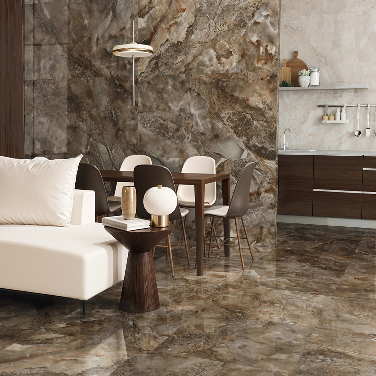 اورا براون من شركة عالم البنيان بورسلين اسباني لامع بشكل رخامي فخم وبلون بني غامق يمكن استخدامها كديكور للحمامات كلمسة فنية فخمة متوفرة بجميع المقاسات