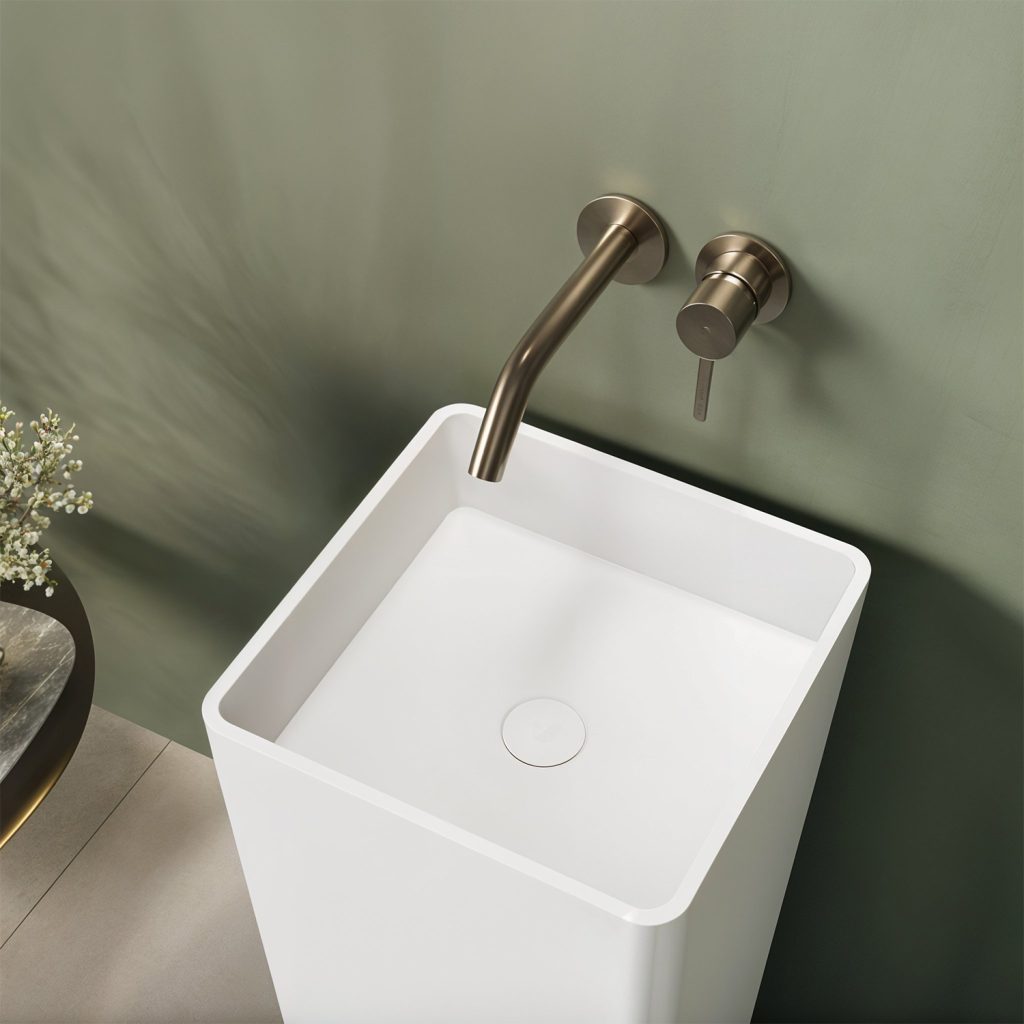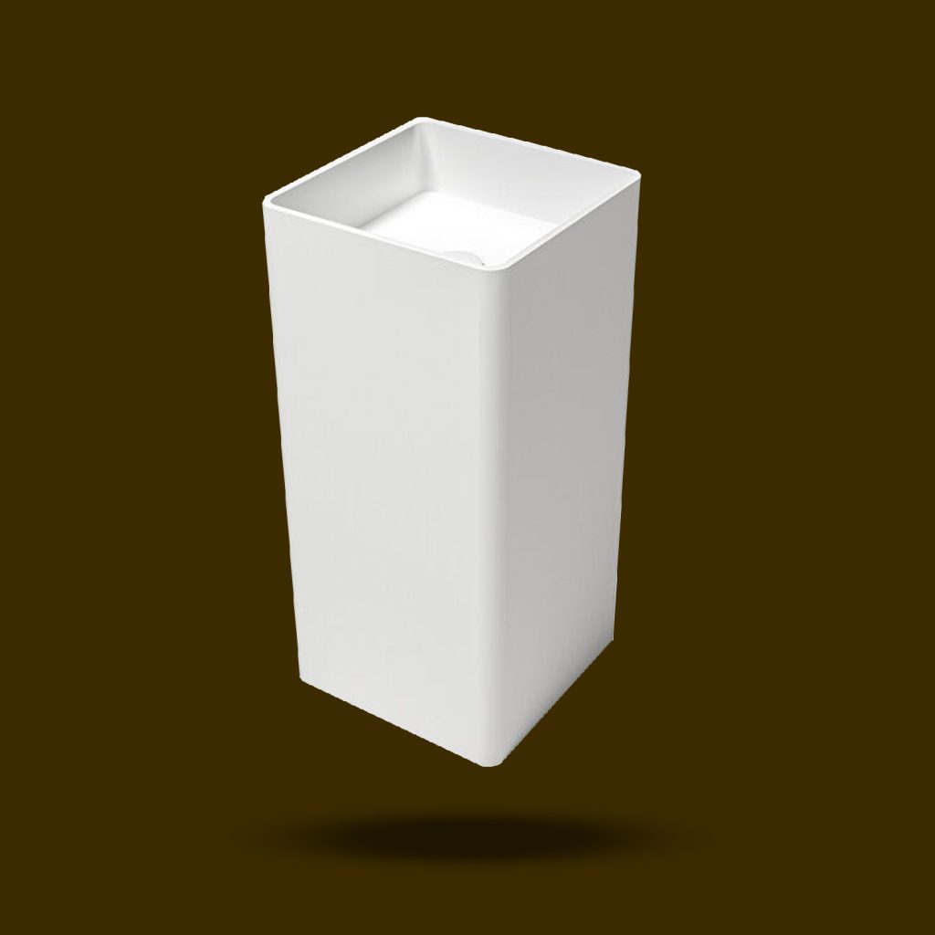 من شركة عالم البنيان يتميز بتصميمه المربع وخطوطه العمودية المستقيمة، ما يمنحه طابعًا نحتياً متناسقًا وأنيقًايأتي الحوض مزودًا بصمام مطابق للتصميم تم تصنيع من مادة ، التي تمنحه ملمسًا ناعمًا بشكل مذهل كما أن هذه المادة شديدة النظافة ومقاومة للبكتيريا، مما يجعلها مثالية للاستخدام في الحمامات اللون القياسي للحوض هو الأبيض الجليدي مصنوع من مادة (solid surface)